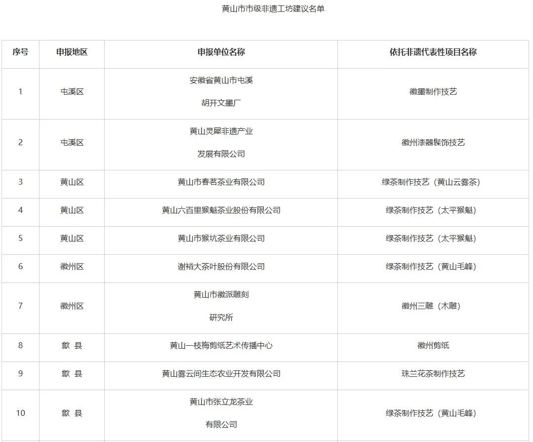 根據(jù)《安徽省文化和旅游廳安徽省人力資源和社會保障廳安徽省農(nóng)業(yè)農(nóng)村廳關(guān)于印發(fā)<安徽省非遺工坊管理辦法>的通知》要求,市文化和旅游局、市人力資源和社會保障局、市農(nóng)業(yè)農(nóng)村局聯(lián)合組織開展了市級非遺工坊認定工作。經(jīng)申報主體自愿申請、各區(qū)縣初審?fù)扑]、市級評審復(fù)核,形成市級非遺工坊建議名單,共19家,具體名單如下所示: